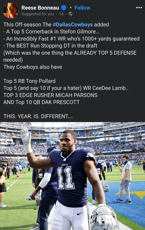Unfortunately, the window is closing fast on any future SB appearances. They've reached a crossroads & will need to decide whether Dak has what it takes to take them to the SB. This might be a make-or-break season for Dak, but the Jerry & Co. could be reluctant to start a full rebuild & give him a short-term contract, similar to what the Vikings have done with Cousins.
